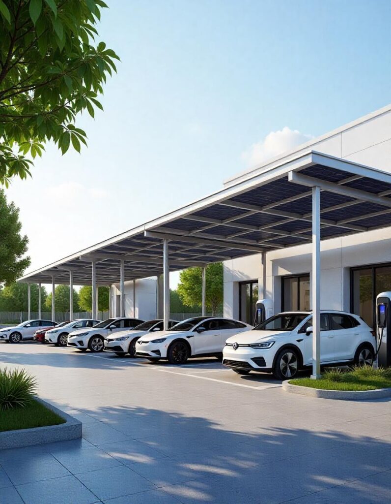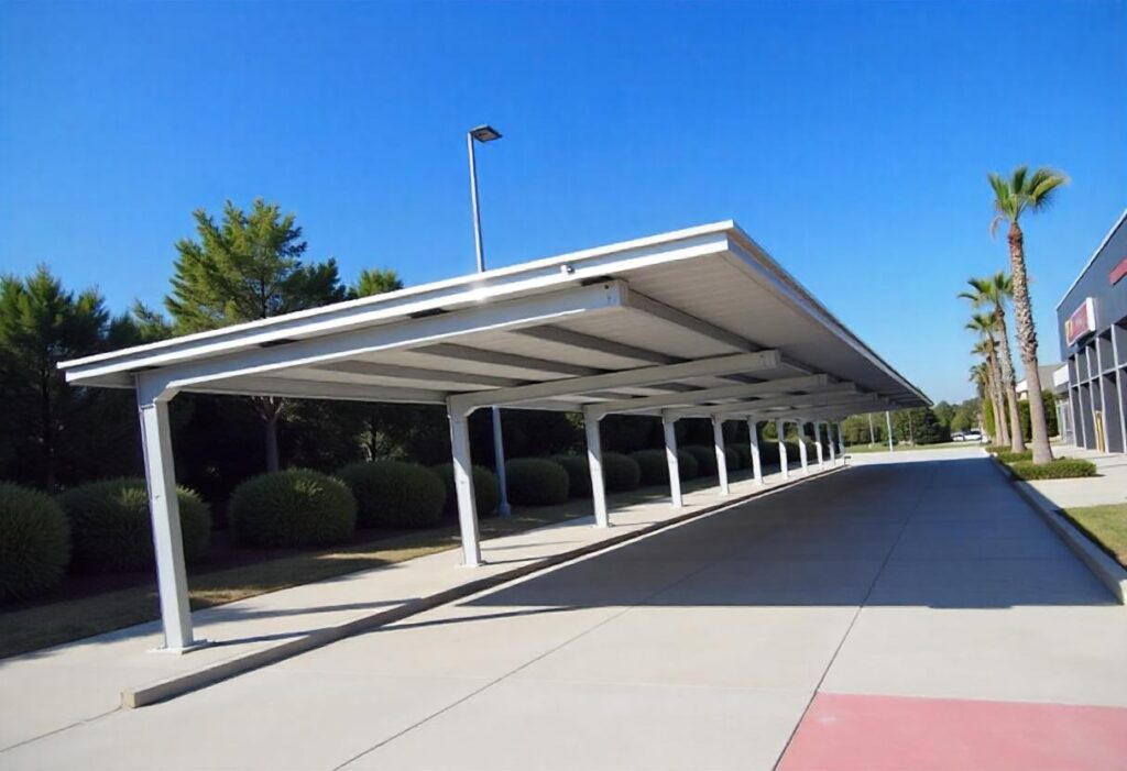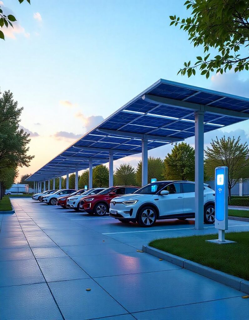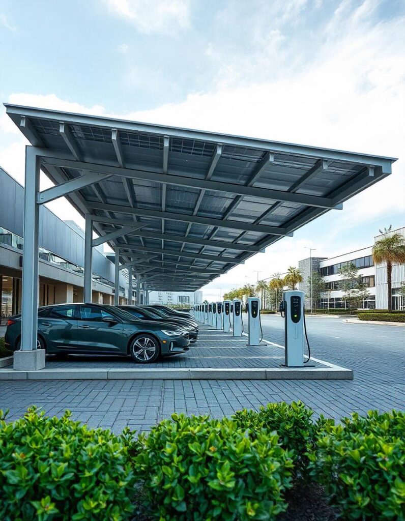 Marquesinas de parking fotovoltaicas diseñadas para proteger vehículos y generar energía al mismo tiempo.